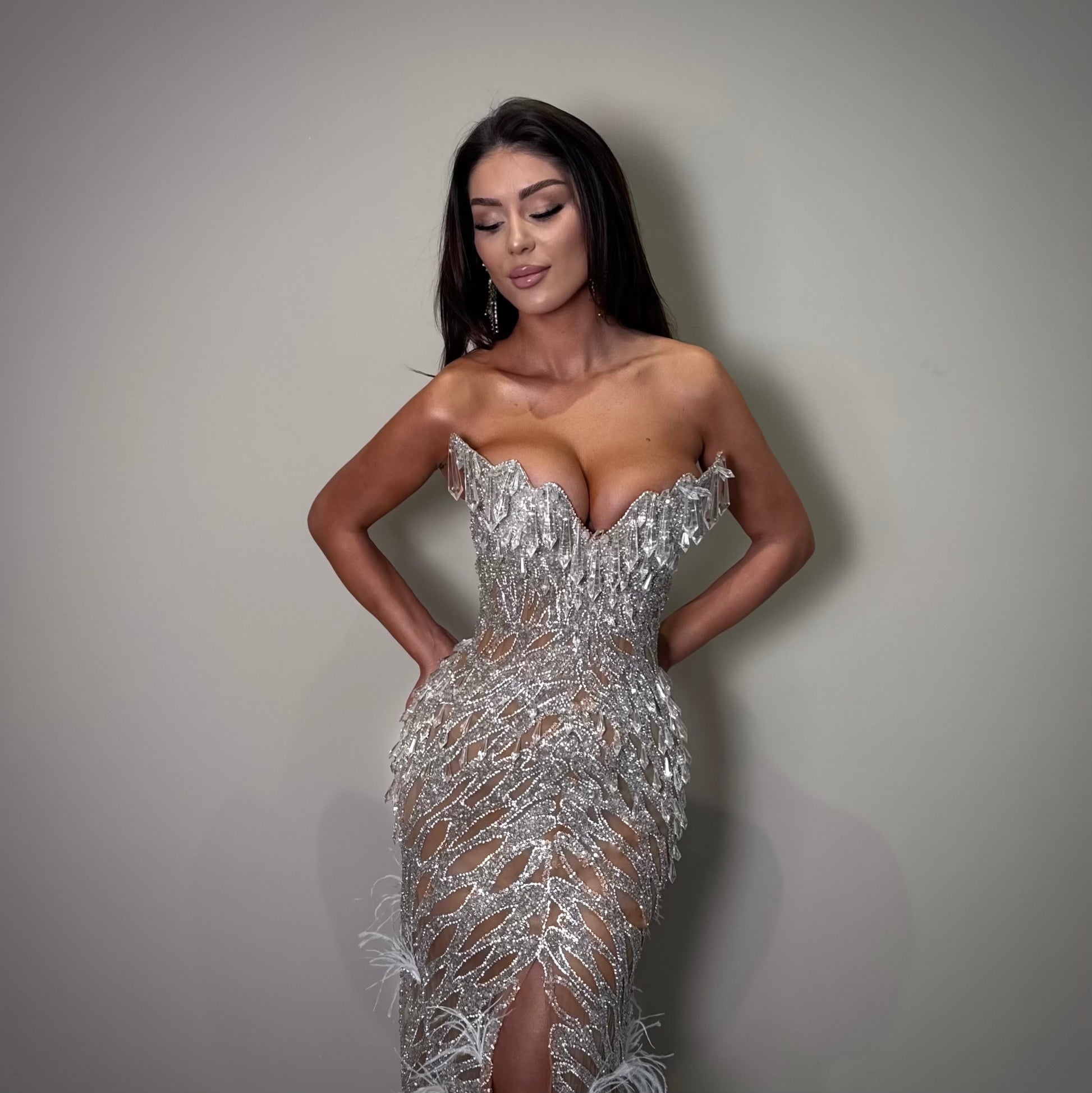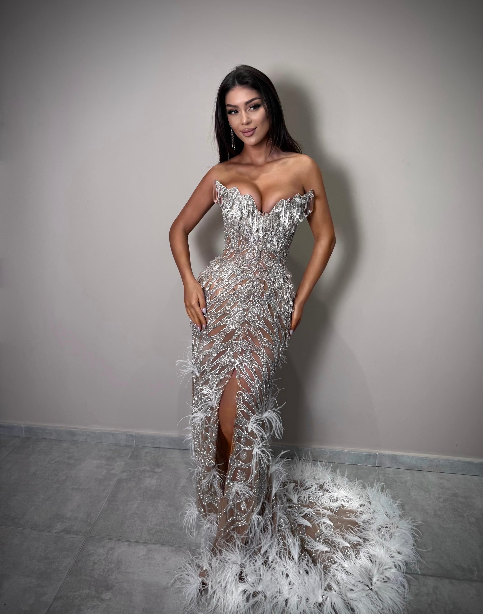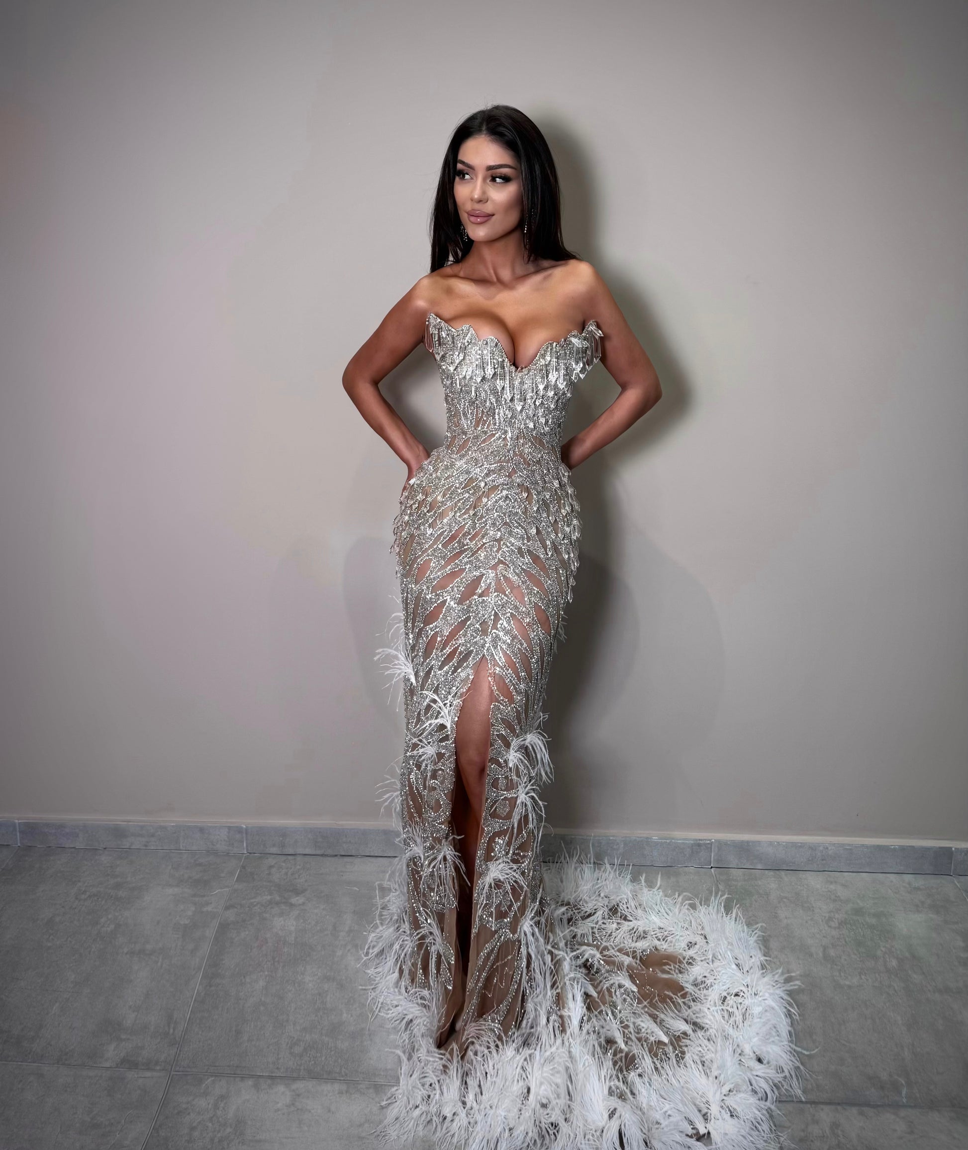 The structured corset bodice enhances the feminine silhouette, while the cascading crystal motifs flow into a dramatic feather-trimmed train that embodies grace and power. The high slit adds modern allure, balancing opulence with confidence.