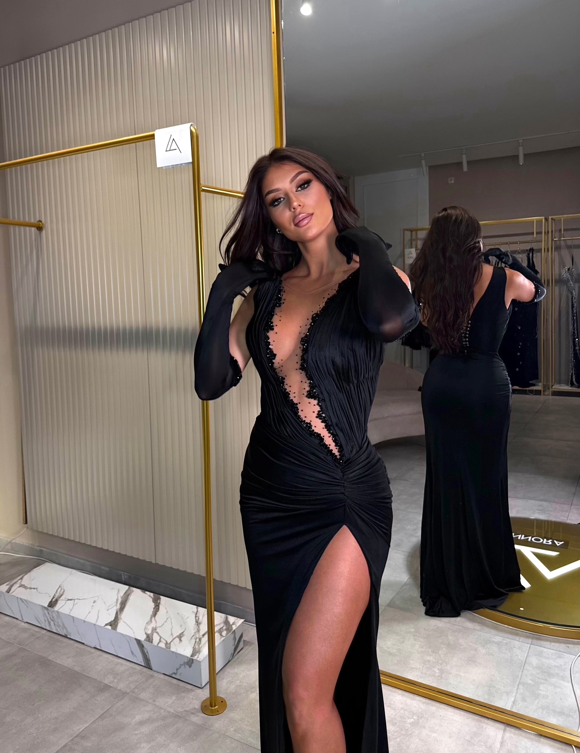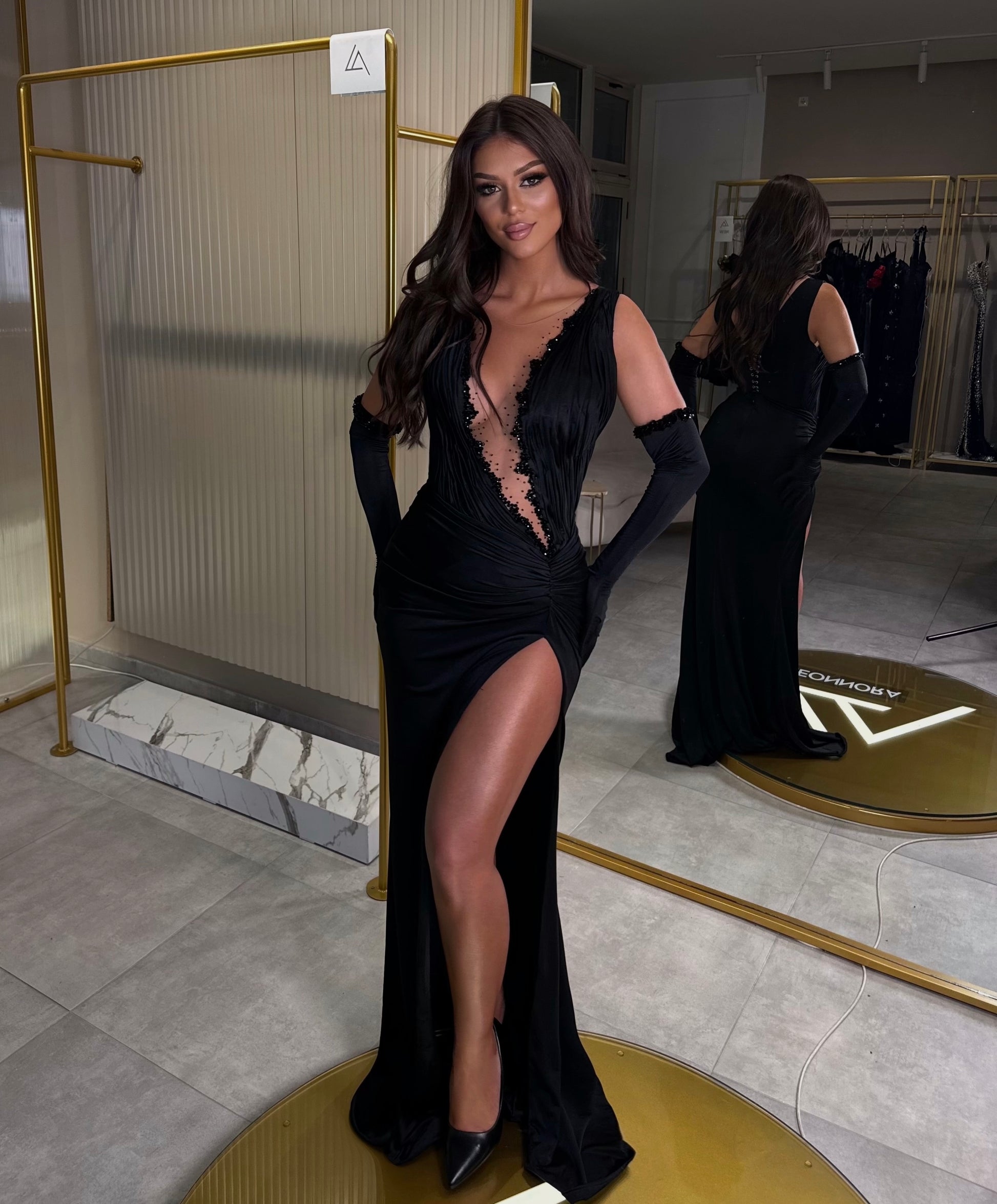 The Noir Dress embodies bold elegance with its sculpted silhouette and deep plunging neckline, detailed with hand-applied black crystals. Crafted from premium black elastic rubber fabric, it embraces the body with perfect stretch and shine, creating a second-skin effect that defines confidence.