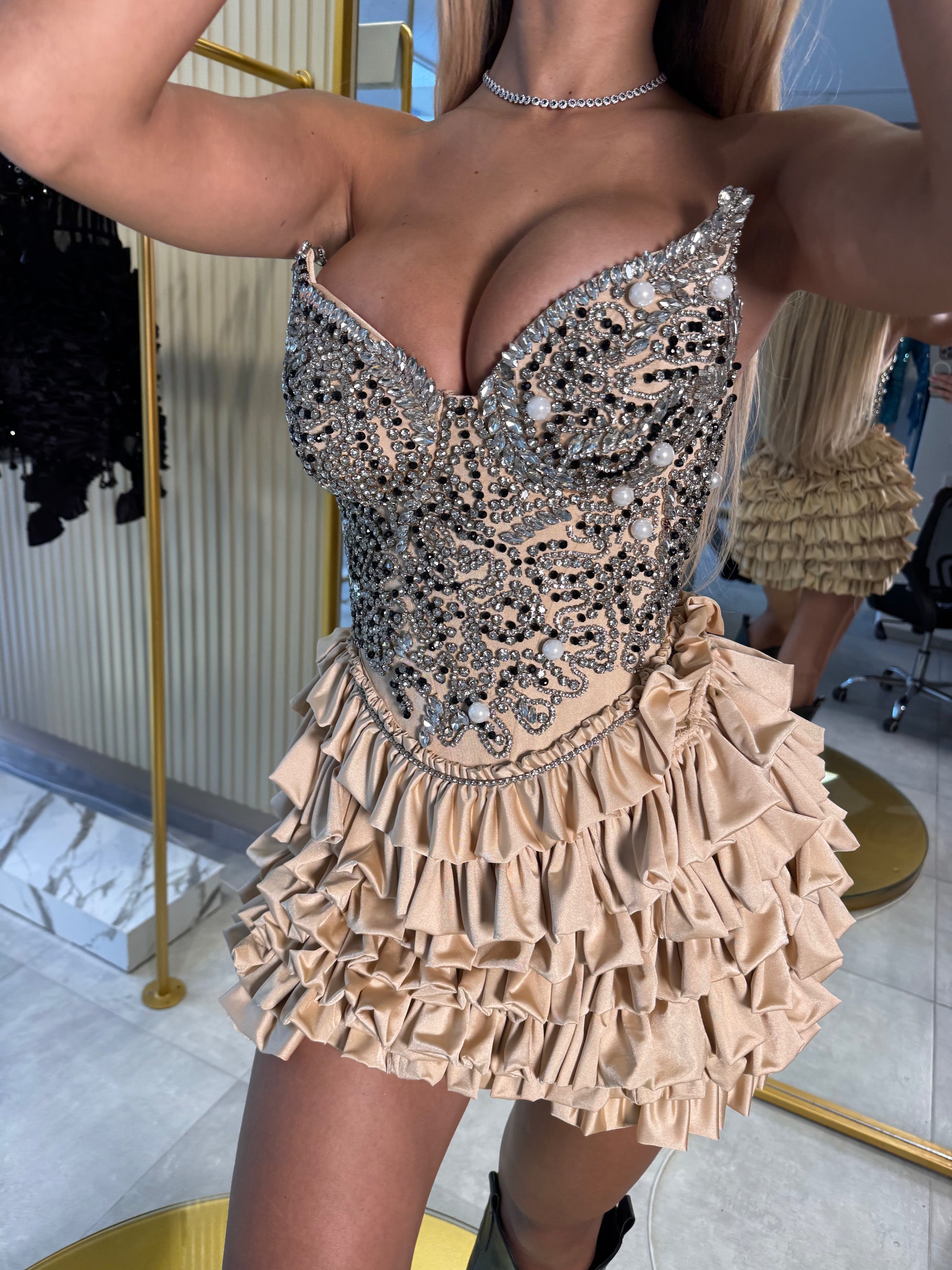 A short corset dress that blends luxury and craftsmanship. The corset is entirely handmade, embellished with delicate stones, beads, and pearls for a radiant finish that sparkles with every movement. The ruffled skirt adds volume and charm, giving the dress a playful yet elegant silhouette. The tied-back design ensures a perfect adjustable fit, highlighting the waist and accentuating your figure beautifully.